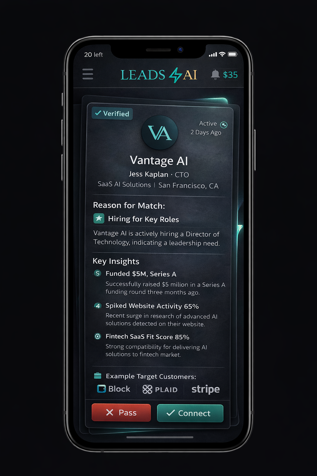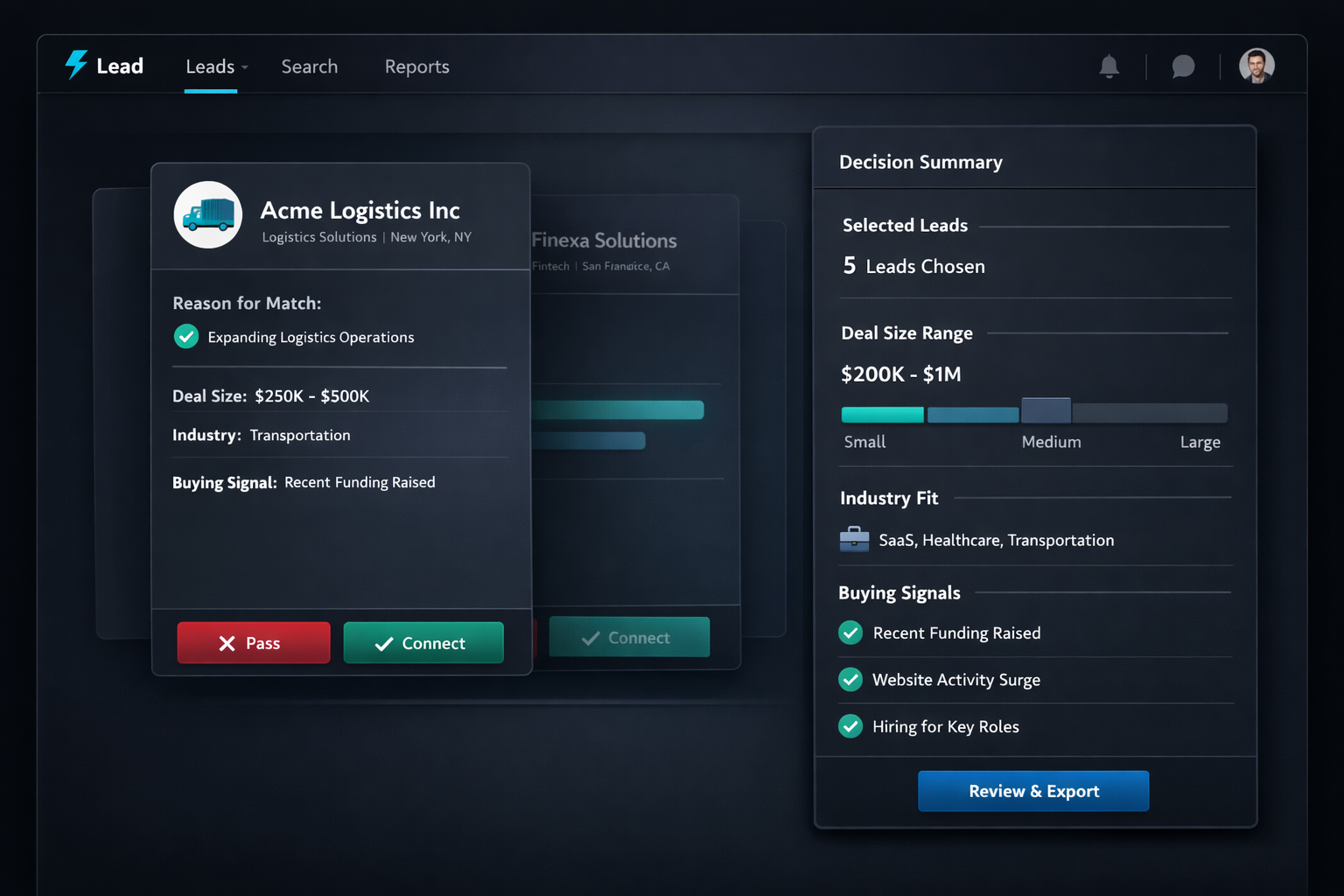 Leads⚡AI surfaces qualified B2B decision-makers and clearly explains why they fit — so you don’t waste time guessing.